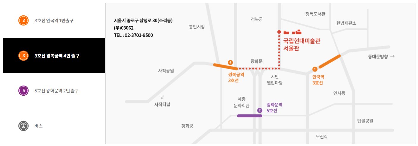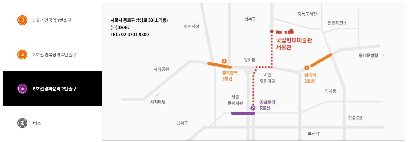 - 지하철 3호선을 이용하실 경우에는 안국역 1번 출구와 경복궁역 4번 출구를 이용하시면 되고요. 지하철 5호선은 광화문역 2번 출구로 나와서 걸어오실 수 있습니다. 버스 정류장 위치는 아래 그림을 참고해주세요. 그림을 누르시면 확대해서 보실 수 있어요.