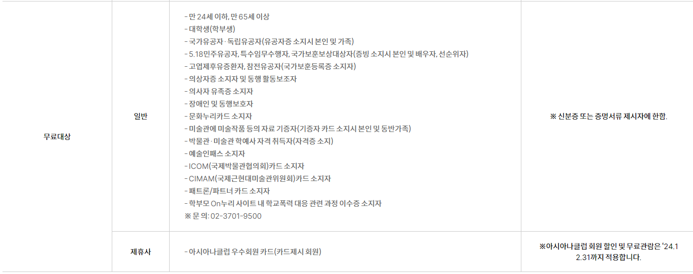 - 관람권 무료대상: 만 24세 이하, 만 65세 이상은 무료 관람이 가능하며, 대학생, 국가유공자, 독립유공자 등 많은 분들을 대상으로 무료관람이 가능한데 자세한 내용은 아래를 참고해주세요.