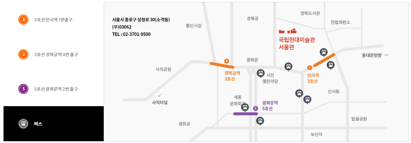 - 지하철 3호선을 이용하실 경우에는 안국역 1번 출구와 경복궁역 4번 출구를 이용하시면 되고요. 지하철 5호선은 광화문역 2번 출구로 나와서 걸어오실 수 있습니다. 버스 정류장 위치는 아래 그림을 참고해주세요. 그림을 누르시면 확대해서 보실 수 있어요.