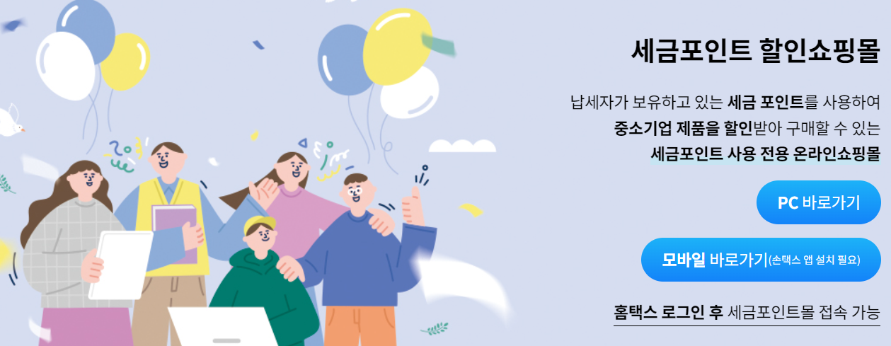 '세금포인트 할인쇼핑몰'은 중소기업유통센터와 국세청이 협력하여 중소기업 판로 지원 및 성실 납세문화 조성을 위해 만든 쇼핑몰입니다. 세금을 납부한 국민이라면 누구나 이용 가능하며, 홈택스에 적립된 세금포인트를 사용해 중소기업 제품을 5% 할인된 가격으로 구매할 수 있습니다.