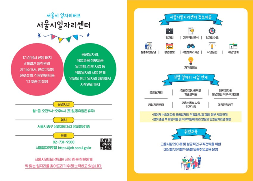 일자리 가이드북은 서울일자리포털(job.seoul.go.kr)에서 다운로드하거나 열람할 수 있으며, 서울시 일자리센터와 25개 자치구 일자리센터 등 주요 기관에 비치될 예정입니다. 서울시 일자리센터에서는 ▸1:1 맞춤형 취업 컨설팅 ▸직업교육 정보 ▸취업역량강화 프로그램 등을 제공하여 구직자의 실질적인 취업을 지원하고 있습니다. 상담은 평일 오전 9시부터 오후 6시까지 가능하며, 02-731-9500으로 문의하거나, 별도 예약 없이 방문해도 됩니다.
