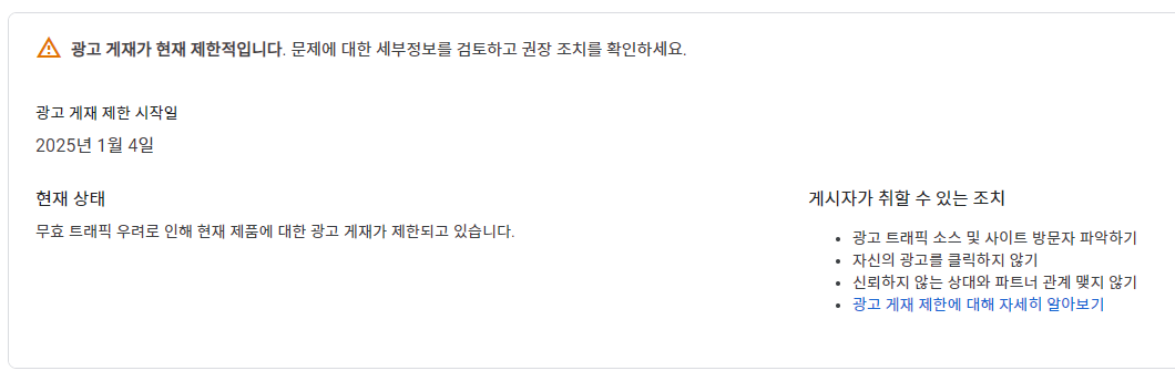 광고 게재 제한 시작일과 현재 상태가 무효 트래픽 우려로 인해 현재 제품에 대한 광고 게재가 제한되고 있다고 나온다. 근데 아무리 생각해도 나는 내 광고를 클릭하지도 않았고, 애널리틱스를 통해 분석해 보아도 그 시간에 무효 트래픽 공격도 받은 적이 없다. 해당하는 날 글을 쓰지도 않았을뿐더러 그날 애드센스 수익은 평소와 비슷했다. 무엇이 문제였을까?