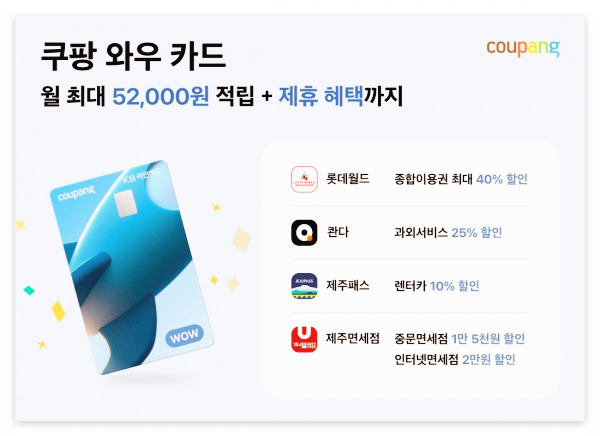쿠팡 와우카드, 롯데월드 어드벤처 최대 40% 할인 및 제주도 렌터카·면세점 추가 할인 혜택 안내