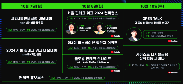 이번 핀테크 위크는 총 10개의 프로그램으로 구성되어 있습니다. 그 중 몇 가지 하이라이트를 소개할게요!
