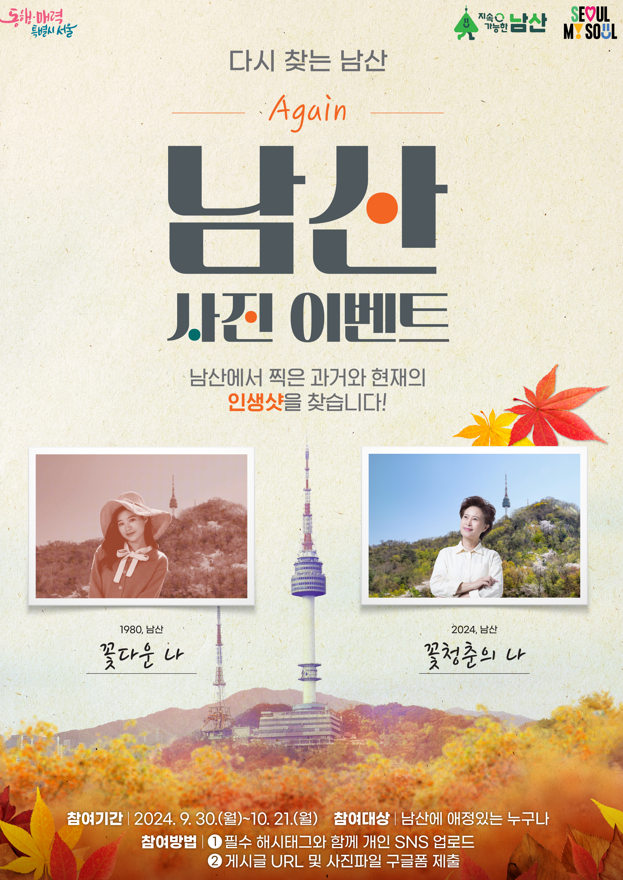 서울시가 가을을 맞아 남산에서 특별한 사진 이벤트, <AGAIN 남산>을 진행합니다. 이번 이벤트는 과거 남산을 배경으로 촬영한 사진을 현재 시점에서 다시 재연해 찍는 독특한 콘셉트로, 남산을 배경으로 한 추억을 새롭게 만들어보는 기회를 제공합니다.
